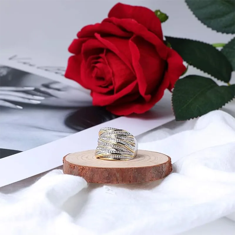 Atraente cor dupla de ouro e prata: o material deste anel moderno é cobre e combina um revestimento de duas cores de ouro e prata para melhorar o apelo visual. Esse contraste adiciona uma sensação de luxo, parecendo um anel de ouro 14K sem desbotar.