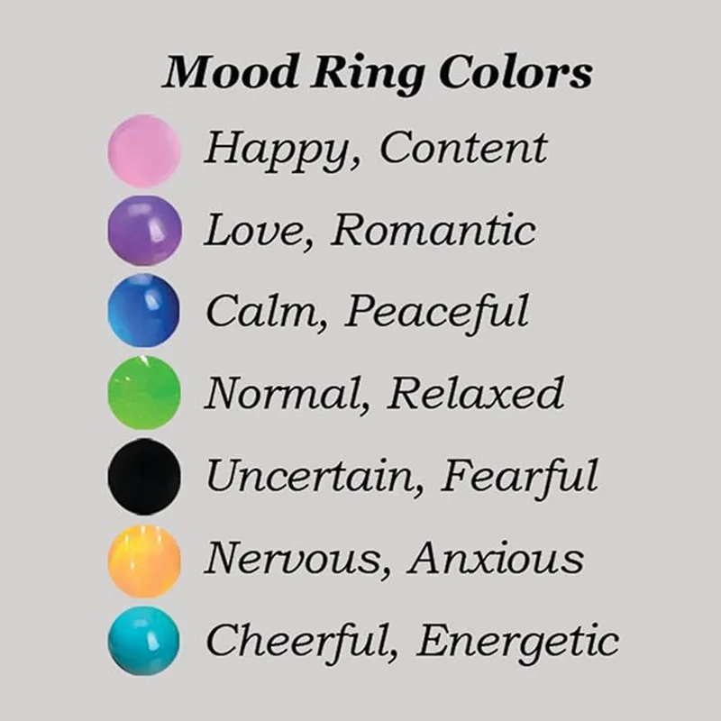 Cada anel é colocado em uma caixa especial em formato de coração, que vem com um gráfico de anéis emocionais para entender o significado de cada cor, e está pronto para ser dado de presente.